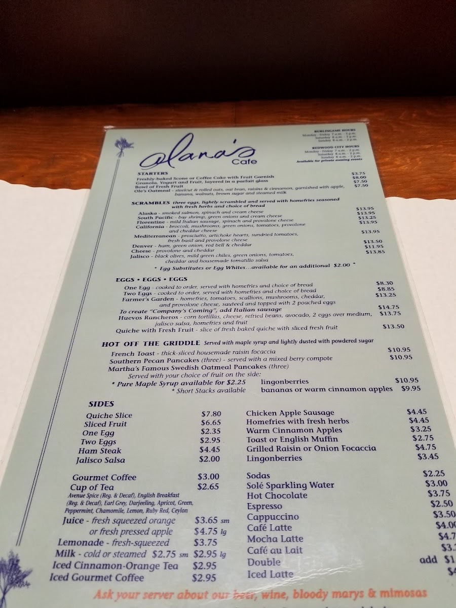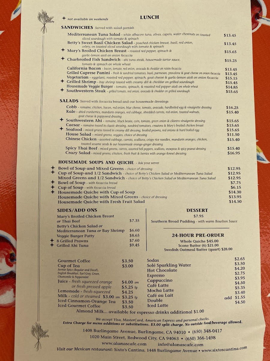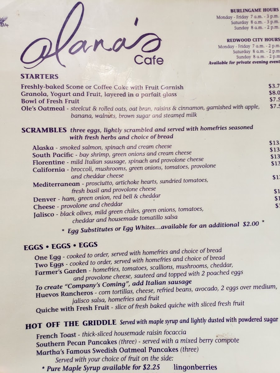 When you step into Alana's Cafe, you’re in for a treat. Located at 1408 Burlingame Ave, Burlingame, CA, this cozy spot offers a menu that’s as welcoming as its atmosphere. Whether you're in the mood for a hearty breakfast to kick off your day or a light, flavorful lunch, there's something here for everyone. From classic comfort foods to creative twists on traditional dishes, Alana's Cafe Menu features a variety of options that cater to all tastes.