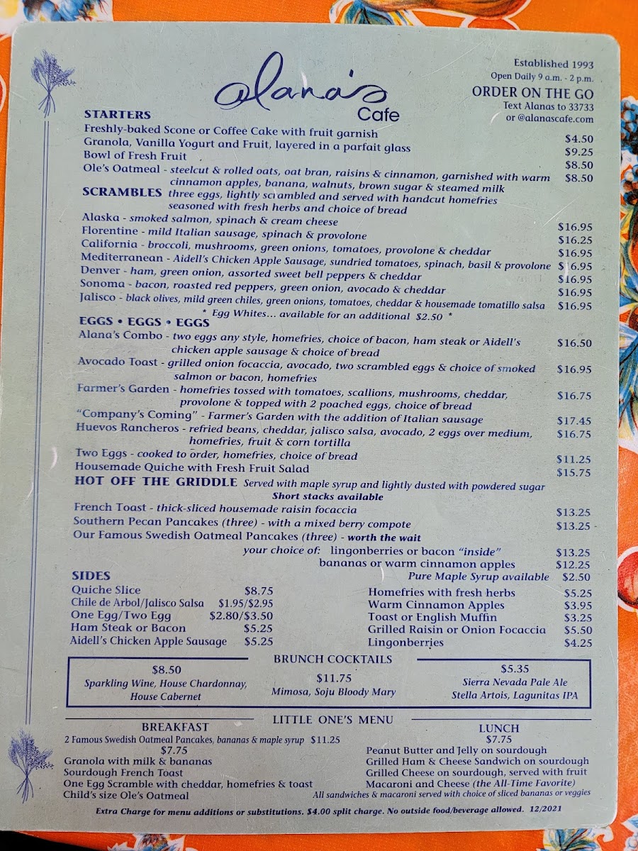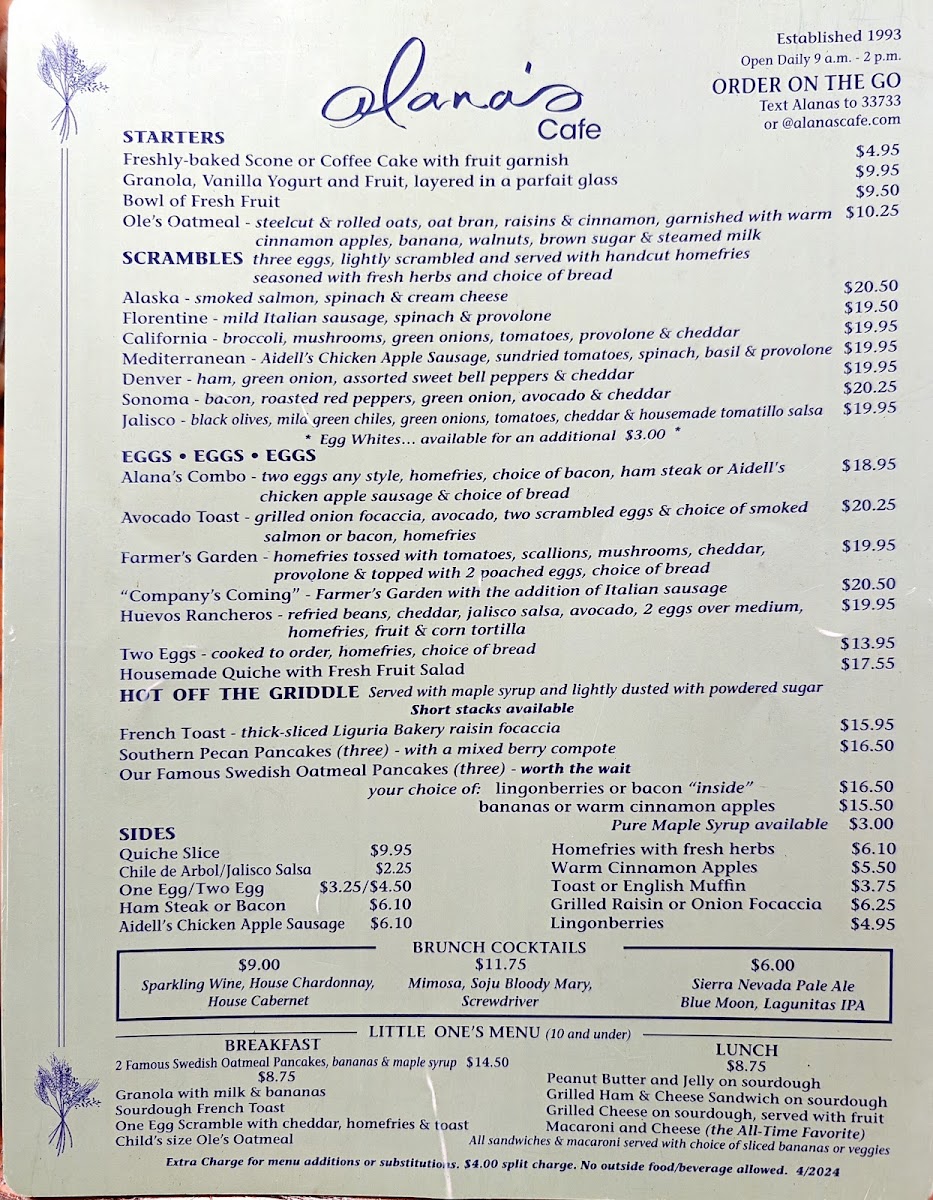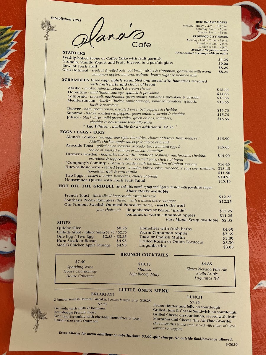 When you step into Alana's Cafe, you’re in for a treat. Located at 1408 Burlingame Ave, Burlingame, CA, this cozy spot offers a menu that’s as welcoming as its atmosphere. Whether you're in the mood for a hearty breakfast to kick off your day or a light, flavorful lunch, there's something here for everyone. From classic comfort foods to creative twists on traditional dishes, Alana's Cafe Menu features a variety of options that cater to all tastes.